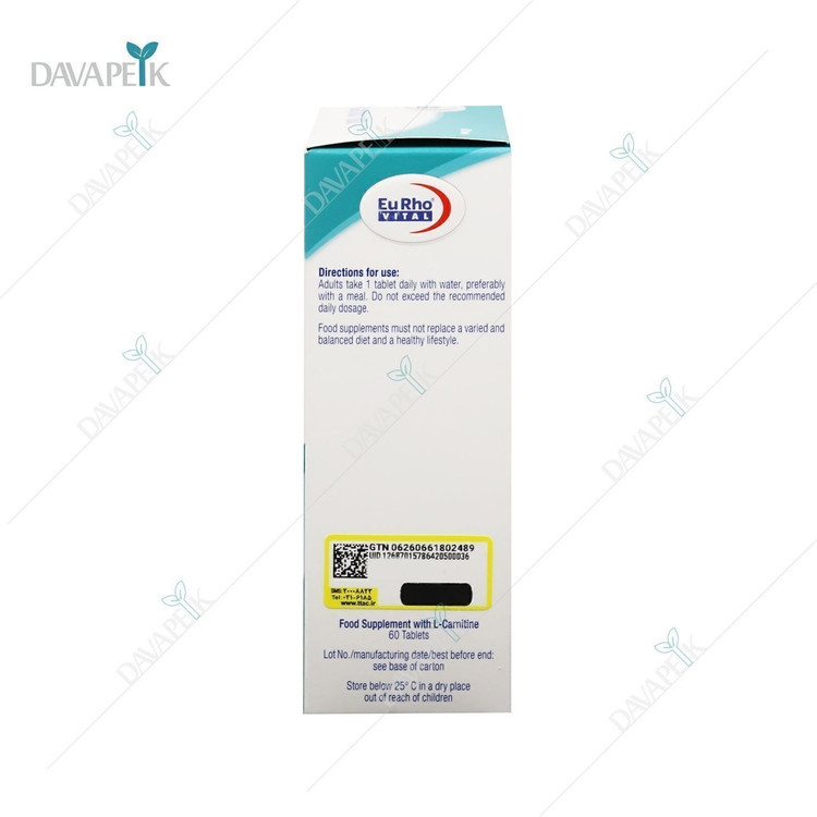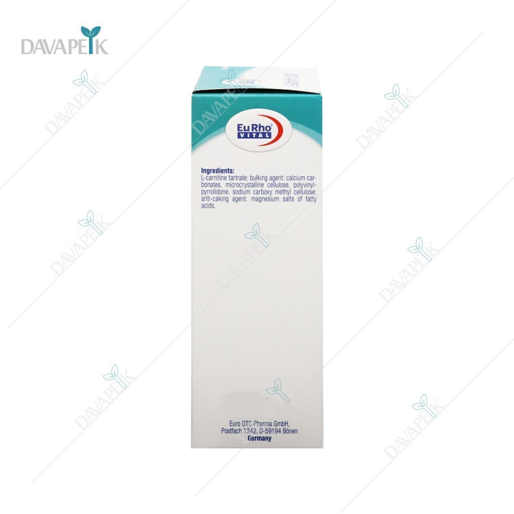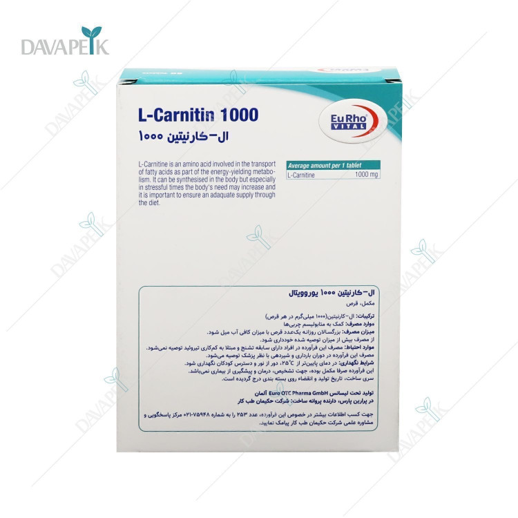 قرص ال کارنیتین ۱۰۰۰ یورو ویتال Eurhovital L-Carnitin 1000mg محصول جدیدی از سری محصولات یوروویتال و حاوی آمینو اسید ال کارنیتین است. قرص کارنیتین ۱۰۰۰ یوروویتال یک مکمل برای کمک به افزایش سوخت و ساز بدن و متابولیسم بهتر چربی هاست. قرص ال کارنیتین ۱۰۰۰ یوروویتال حاوی ۶۰ عدد قرص در هر بسته است که هر قرص حاوی ۱۰۰۰ میلی گرم ال کارنیتین است.